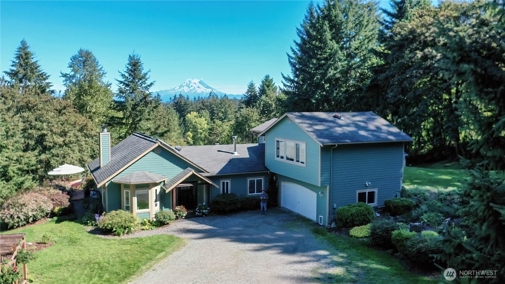 Beautiful estate on 5ac where self-sufficiency meets luxury. Meticulously maintained. 3,412sqft gorgeous home w/ADU & own kitchen. Tasteful high end finishes. Grand open spaces, soaring ceilings & walls of windows frame nature & Mt Rainier views. Spacious living room w/stone hearth fireplace & space for concert piano. Huge chef's kitchen w/ample cabinets, pantry, Corian counters, center isle & extra sink, rare Kitchen Queen wood cookstove & slider to garden room. Sound system. Wood raised panel doors & custom trim. Expansive deck. Pure water from own well. Hand pump. Fenced garden w/16 raised beds, 16 fruit trees. Green house. Additional 2 car garage/shop. Chicken Coop. Wood shed. Well house. Solar. Generator. RV parking. Electric gate. ++