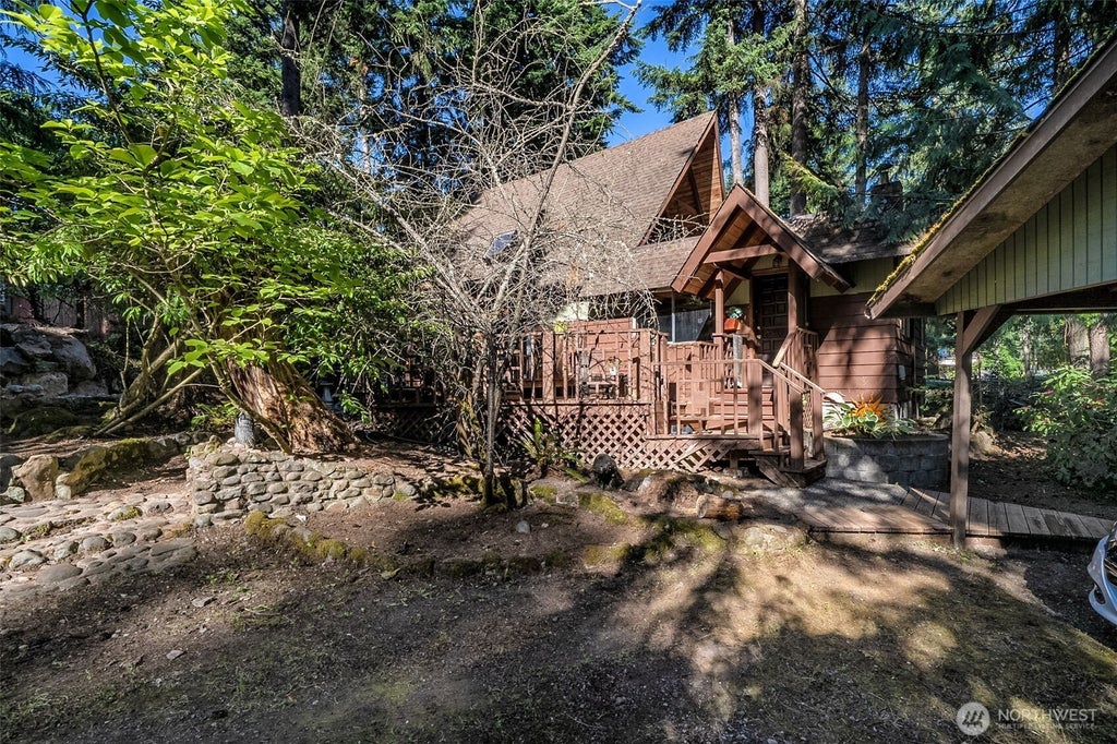 Welcome to this charming 2-bedrm cabin-style home, nestled in the peaceful & private Clearwood community. Ft vaulted ceilings & cozy loft—currently serving as the 2nd bdrm W/ceiling fan & private balcony. Enjoy both a wood burning & propane FP, custom brickwork & skylight that fills the space W/natural light. Main bdrm W/in-unit W/D. A full bath W/tile floors, + a mix of laminate & carpet throughout. Fully fenced yard W/spacious patio/deck for relaxing/entertaining. Additional ft. inc. 2-car carport, driveway parking, & security gate. 2-bed septic & durable comp & torch-down roof. Located in a serene, amenity-rich HOA community offering trails, lakes, swimming pools, & more—the perfect escape for full-time living or weekend retreat.