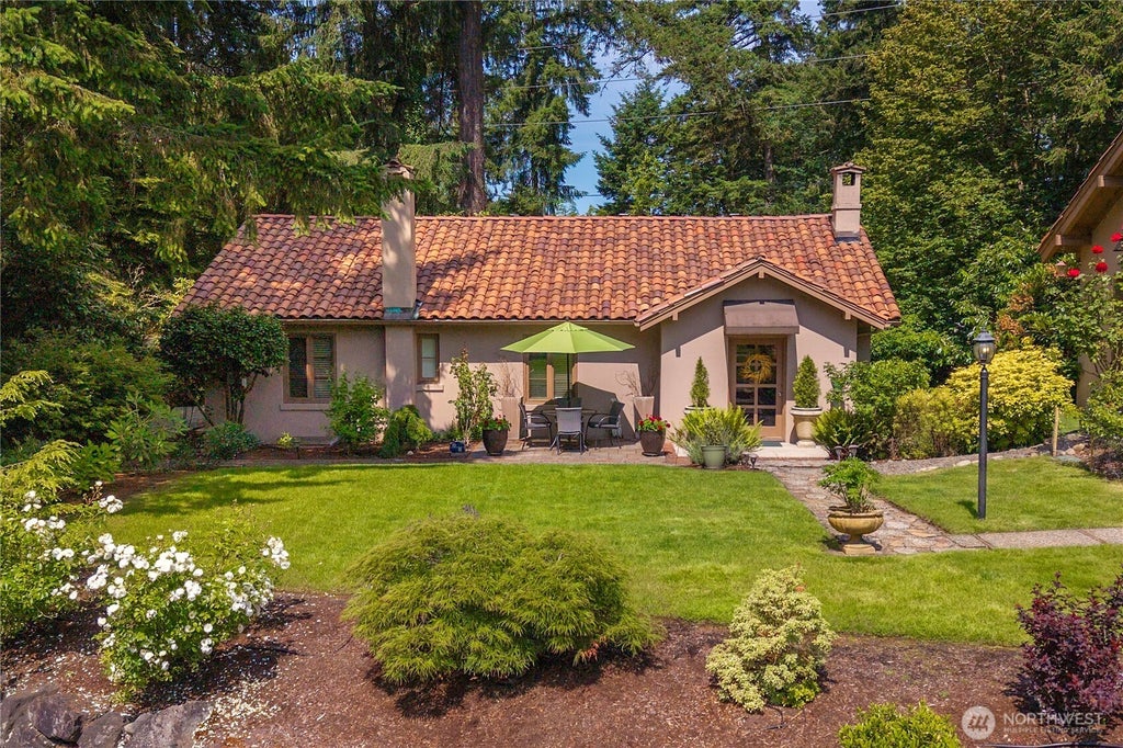 Historic GATE KEEPER's house to Villa Madera allows you to live in HISTORY. Charming details & old world charm provide a back story of a bygone era. ELEVATED CORNER lot & MOVE IN ready home provides an intimate lifestyle; living room w/ wood burning fireplace, original tiles, doors & storied hardware. Dining w/ full light doors to outdoor spaces;35k in exterior upgrades; Kitchen w/ built in desk; tons of natural light. MAIN LEVEL bedrooms, 3 beds total; full bath plus 3/4 bath; lower level bedroom, wine and storage. Detached 2 car garage built 1980 is OVERSIZED ; manicured grounds; irrigation; new outdoor patio; newer windows; newer furnace; newer elec; new fence; impeccably maintained. Proximate to Tacoma Country & Golf Club & JBLM.
