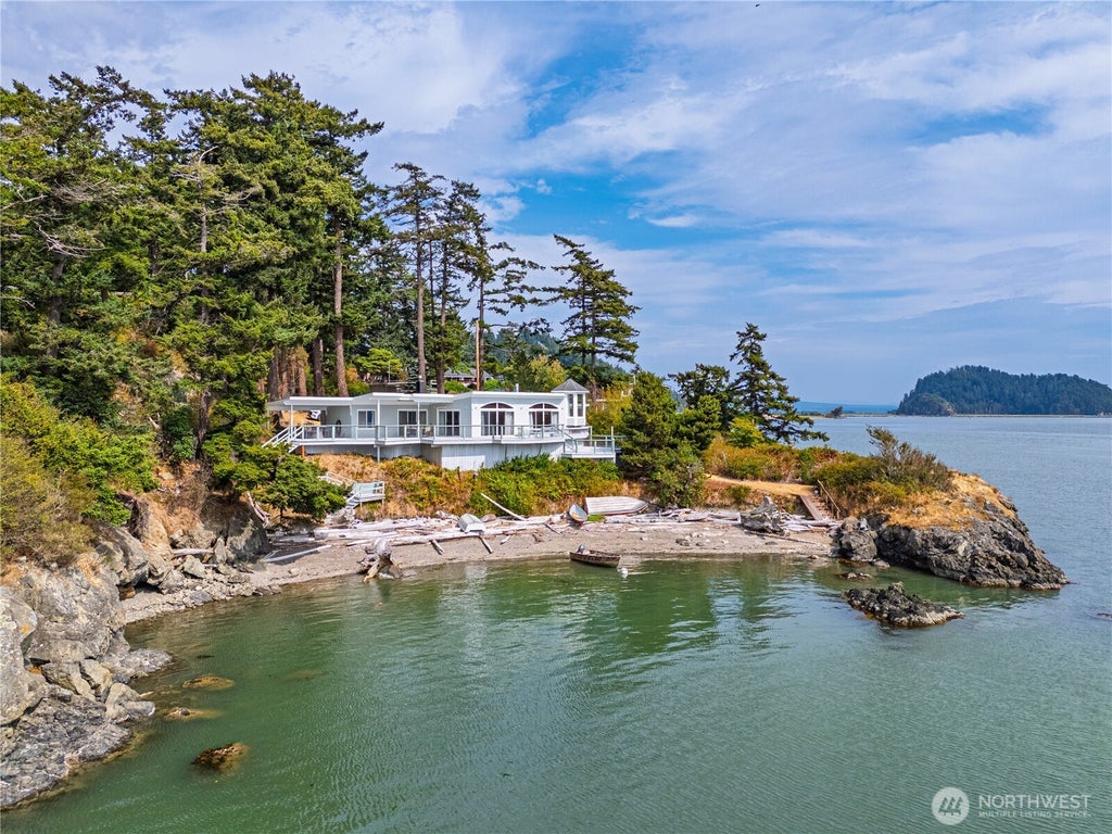 At the farthest reach of Pull and Be Damned Road, this home rests quietly where land meets water, offering an awe-inspiring 180° panorama of the bay, sound, and mountains. Inside, the great room invites you in with a striking river rock fireplace and a wall of windows that frame the ever-changing view. The kitchen features a spacious walk-in pantry, and the primary suite includes a generous walk-in closet for everyday ease. Cozy up with baseboard heat, a ductless mini-split, and a wood insert on chilly evenings. Outside, a full-length back deck creates the perfect setting for watching sunsets, listening to waves, and enjoying peaceful coastal living. A rare find in a truly special place. Located on Leased Land.