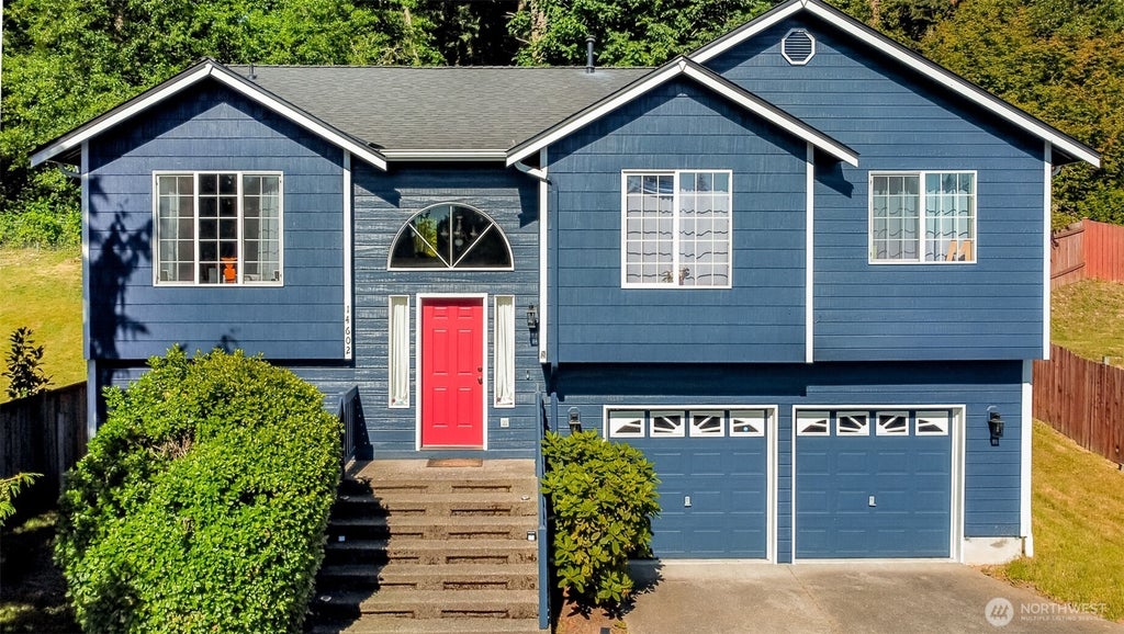 Very private Mid entry home with 4 bedrooms + bonus(freestanding closet stays) which could be 5th bedroom, located in a desirable Puyallup neighborhood. This home features a formal living room & dining room, gas fireplace, family room, vaulted ceilings, skylights, large deck for entertaining & a gorgeous view of Mt. Rainier! New Paint in and out (Sherwin Williams). New hot water heater. $1,500 buyer credit to upgrade range & microwave. Easy access to Canyon road, Woodland, and freeways no need to use busy Meridian Av.