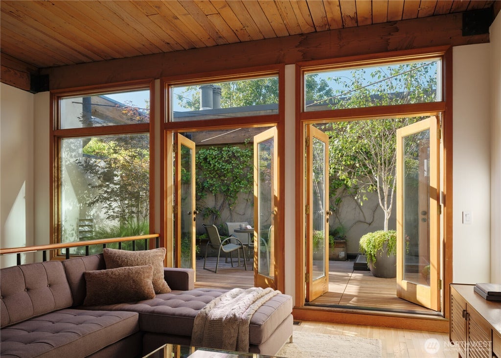 A rare gem in historic Pioneer Square—where old-world charm meets modern living. This one-of-a-kind 2-story condo features exposed brick, soaring wood-beamed ceilings, and natural light cascading through an open staircase. Upstairs, French doors lead to a newly renovated European-style patio—your own private garden oasis. A cozy living room with a wood stove offers the perfect spot to work, read, or unwind. Downstairs offers an open kitchen with custom dining bench—ideal for entertaining, plus a serene bedroom with skylight and generous built-ins. Just one block from the revitalized waterfront and steps to galleries, dining, and culture. Come home to something truly special.