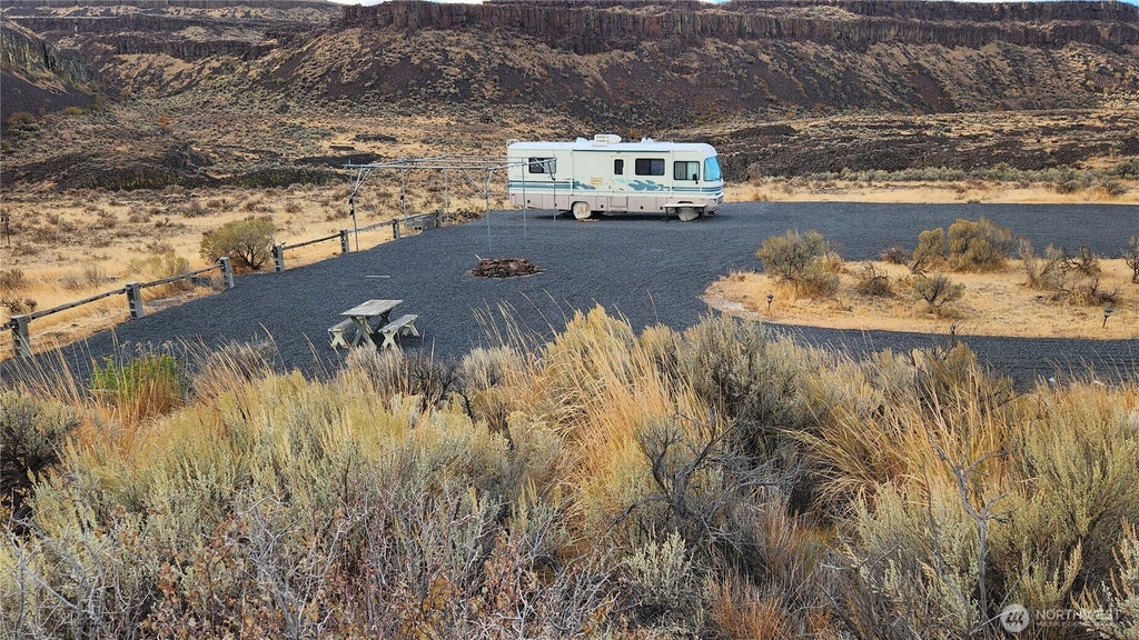 3.22 acres of HIGHLY DESIRABLE lots w/stunning views overlooking the beautiful McCartney Crk, Palisades, & Moses Coulee Canyon. This off-grid property is secluded, very peaceful & gorgeous! It features a gated entry, cleared & heavily graveled terrain, fencing, a metal solar-lit gazebo, and a 30’ SW Storm RV. Practice golf shots from 3 grass T-boxes to a graveled flag area, 2 bow target shooting areas, 2 graveled firepit areas, & lots of room for friends. The sunsets are mesmerizing & the stars at night are breathtaking. Rimrock's amenities include a swimming pool, horseshoes, playground, BBQ & picnic areas. Clubhouse offers a rec-room w/TVs, games, movies, ping pong, vending machines, a kitchen, restrooms, & laundry.